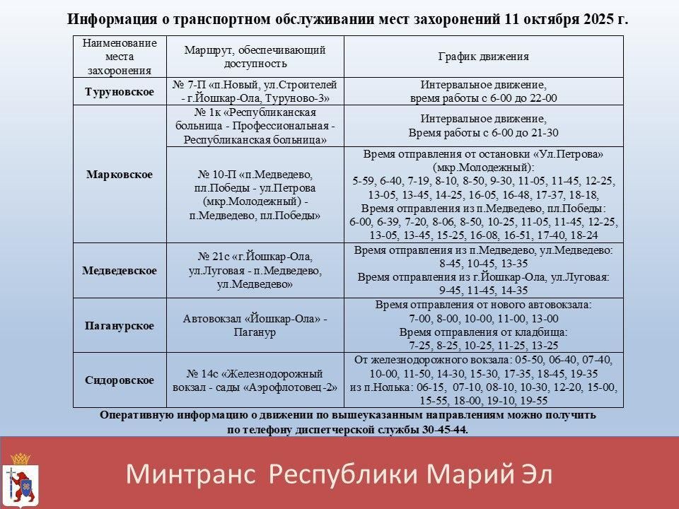 В Покровскую родительскую субботу, 11 октября, в Йошкар-Оле и Медведевском районе будет усилено автобусное сообщение до кладбищ.До Туруновского, Марковского и Медведевского захоронений будут курсировать автобусы по специальным маршрутам. Например...