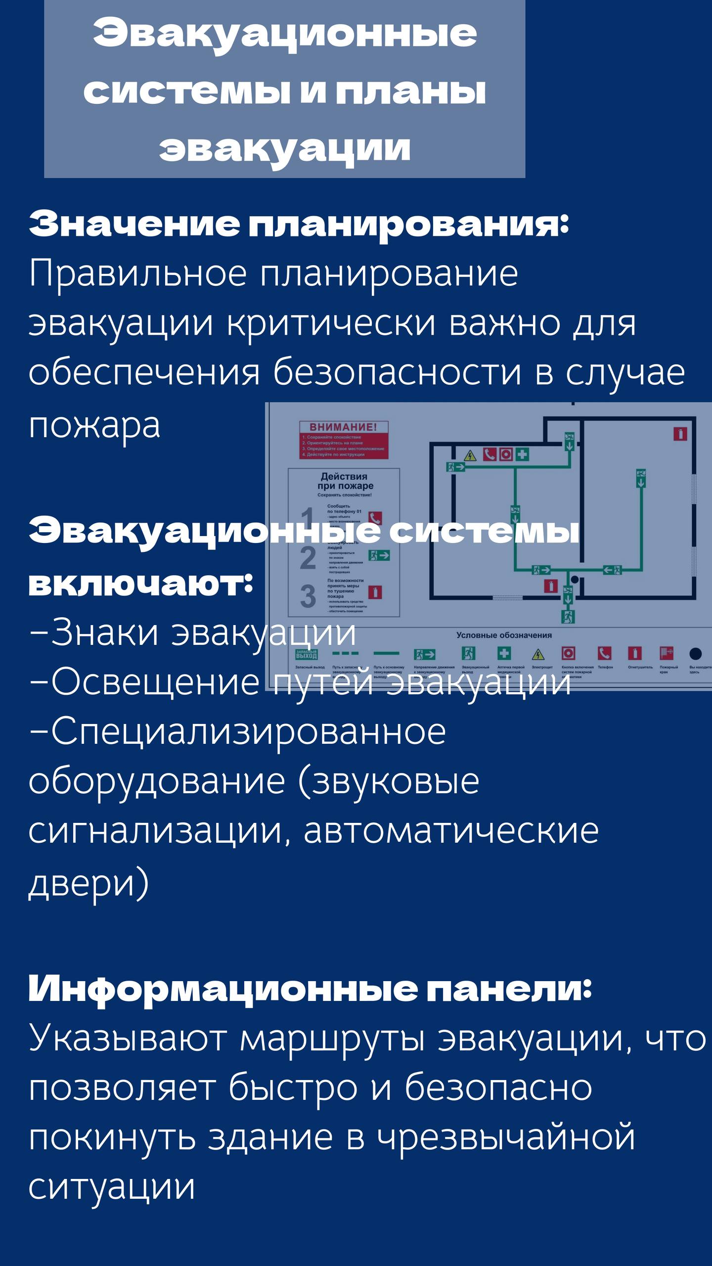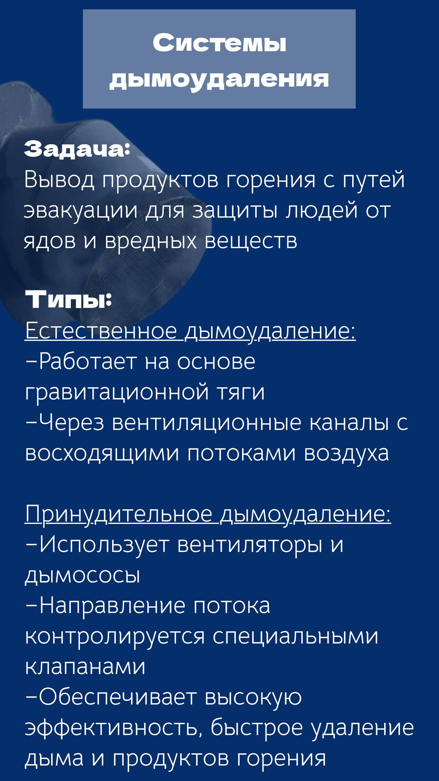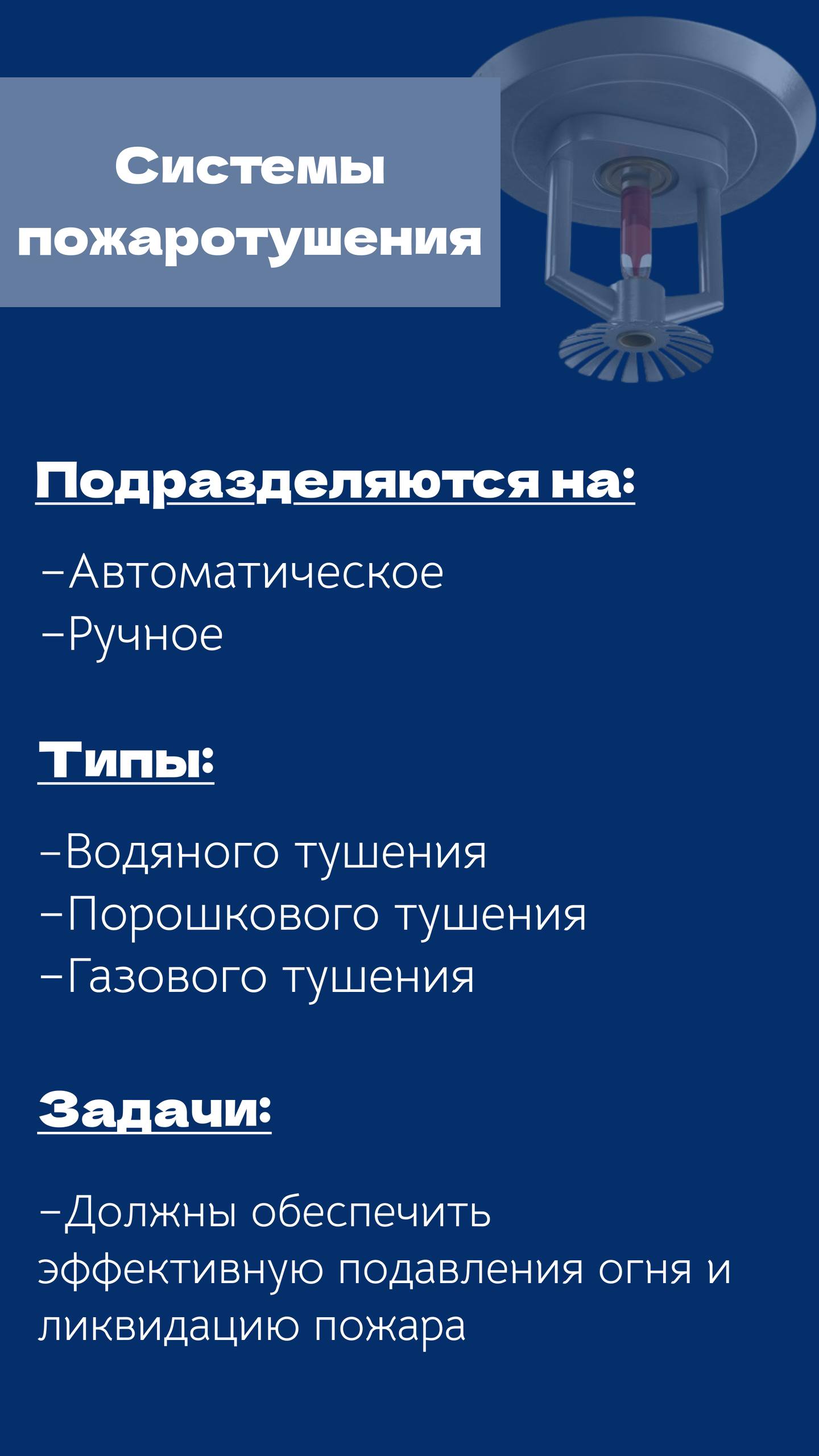 Прочитав эти карточки, вы узнаете о системах пожаротушения и дымоудаления, о противопожарных завесах и перегородках, о пожарной безопасности в проектировании зданий, о эвакуационной системе и планах.