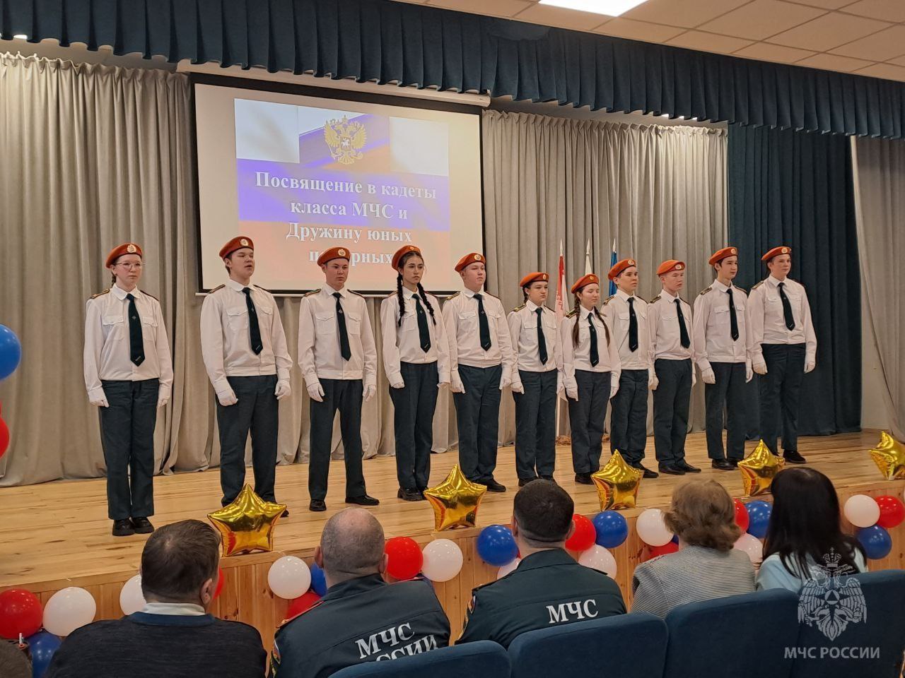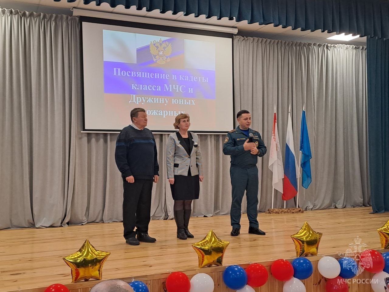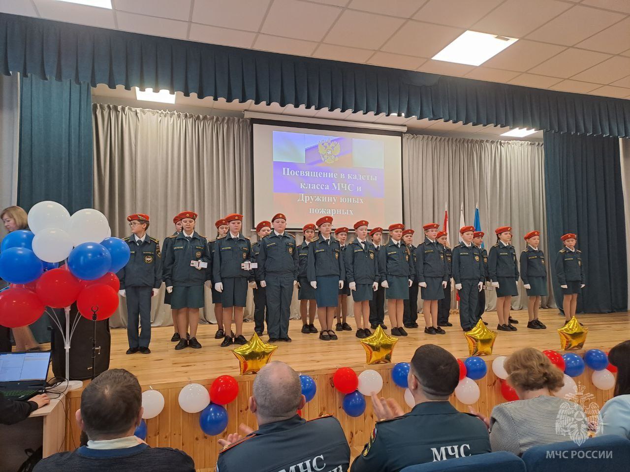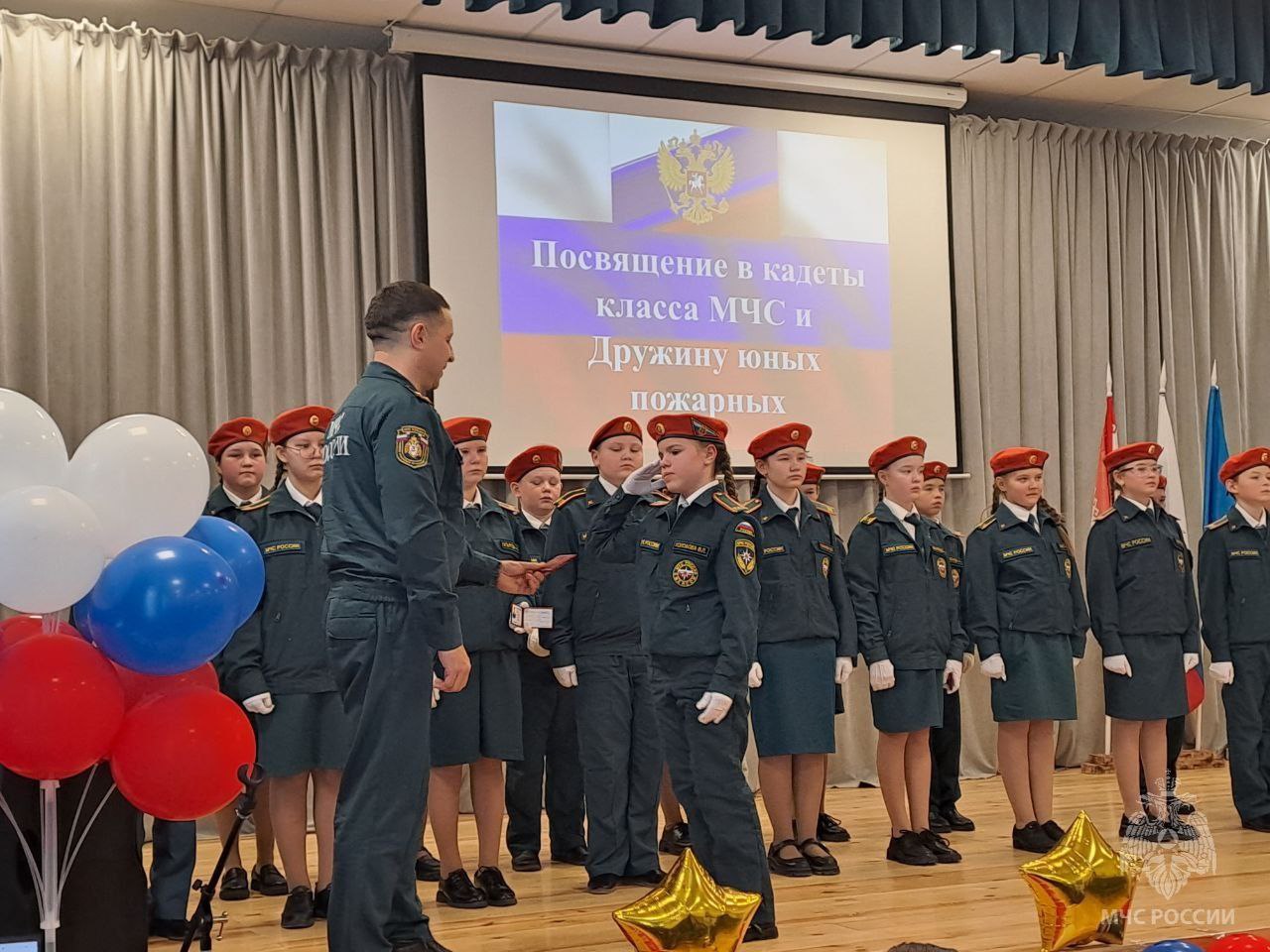 Мероприятие началось с торжественного построения новоиспеченных юных огнеборцев. Перед собравшимися выступил директор школы и объявил церемонию посвящения в кадеты открытой. Ребята дали клятву хорошо учиться, служить примером младшим школьникам, любить Родину, быть внимательными и чуткими, помогать попавшим в беду людям.