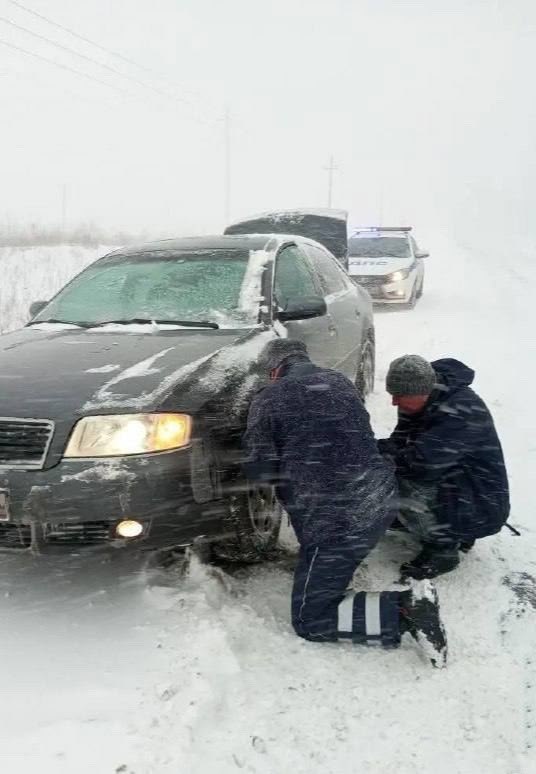 Парни молодцы! Они помогли дедушке и его внучке, у которых на трассе лопнуло колесо во время снегопада.