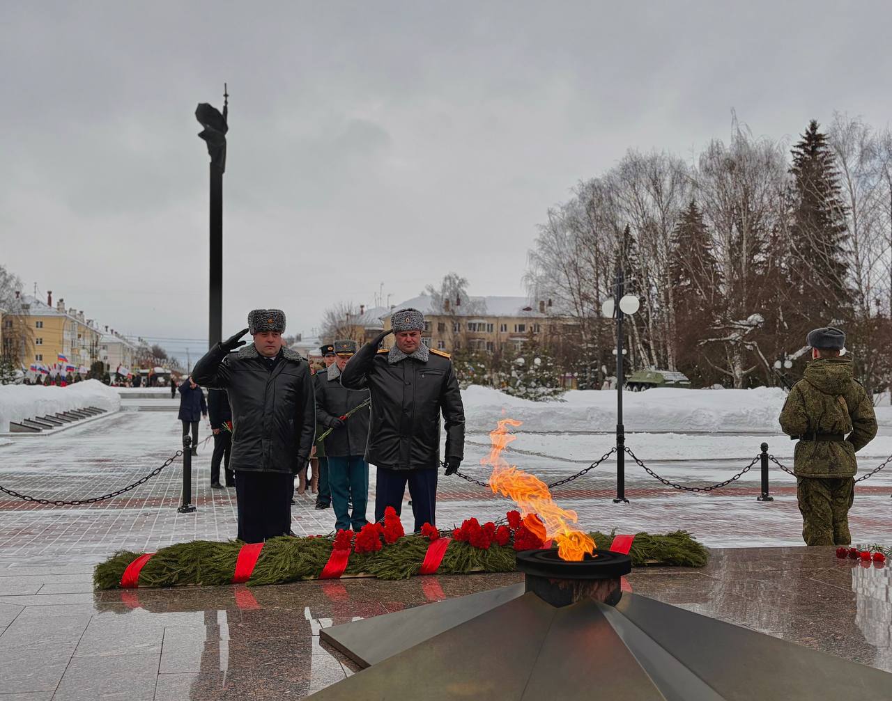 Сегодня, 23 февраля, в День защитников Отечества руководитель следственного управления Следственного комитета России по Республике Марий Эл генерал-майор юстиции Александр Владимирович Рычков вместе с Главой республики, руководителями органов государственной власти, правоохранительных органов региона принял участие в торжественном возложении цветов к монументу Воинской Славы и Вечному огню, а также почтил память жителей республики, защищавших Отчизну, минутой молчания.