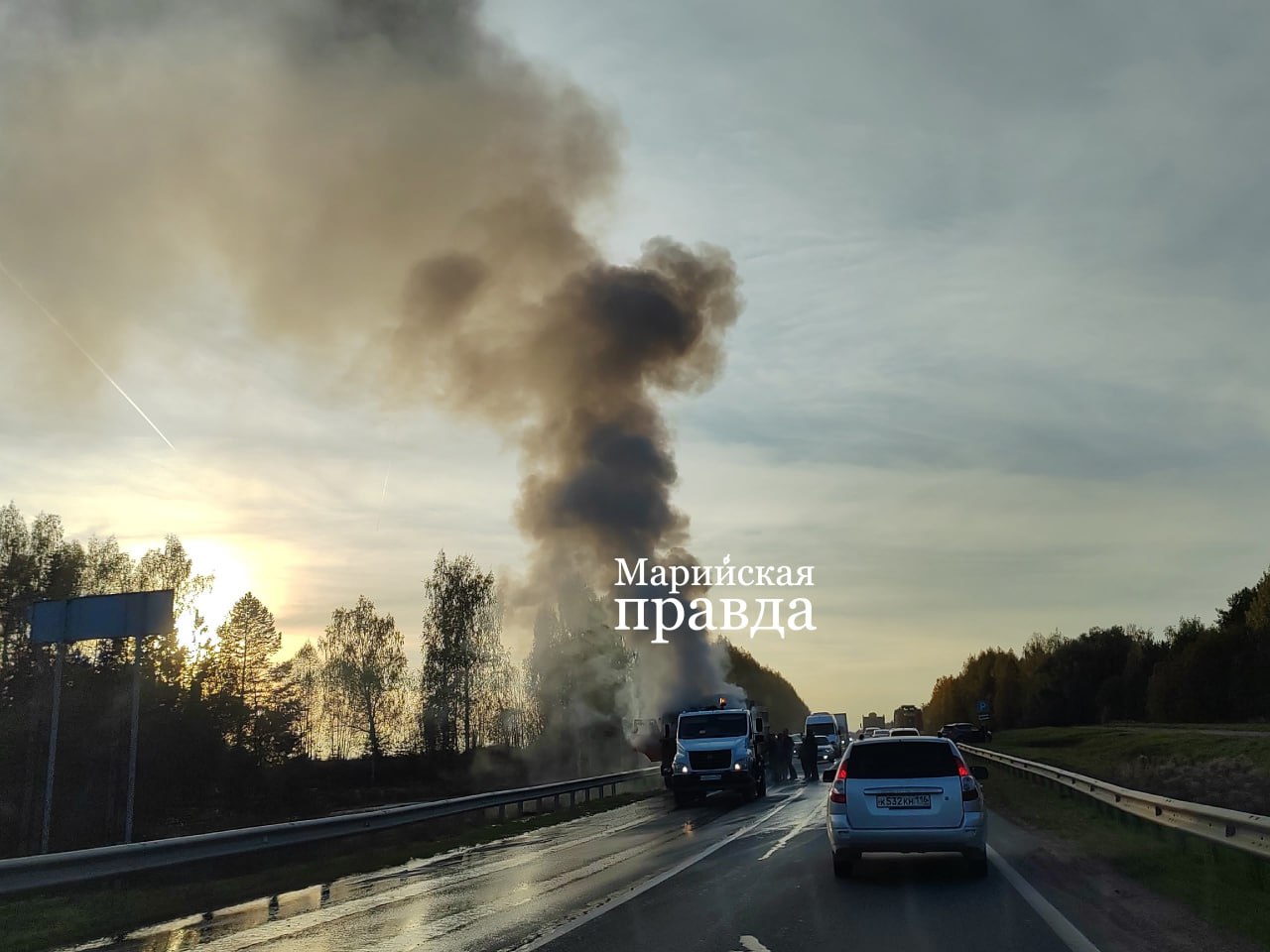 Как сообщили «Марийской правде» очевидцы произошедшего, машина загорелась недалеко от поселка Советский, у родника Дружбы народов. По словам свидетелей, из кабины грузовика выбивается пламя.