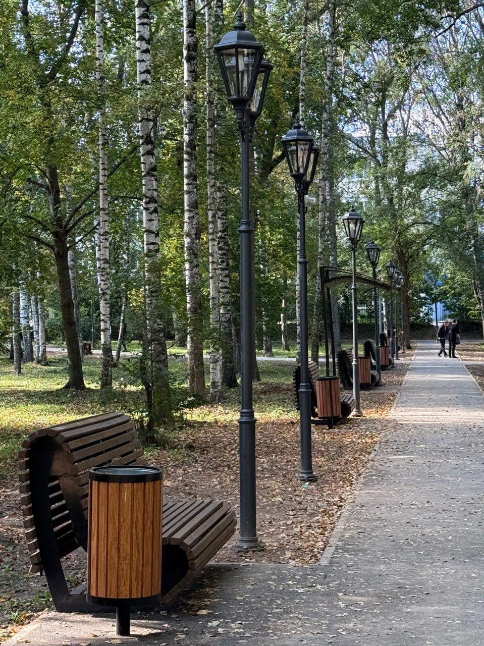 Появились новые тротуары, дорожки и проезды, установлены современные малые архитектурные формы, оборудован навес для мусорных контейнеров. Также специалисты обновили освещение и внедрили систему видеонаблюдения, что сделает прогулки и отдых в парке более безопасными. Кроме того, здесь построен новый общественный туалет — важный элемент инфраструктуры для посетителей.