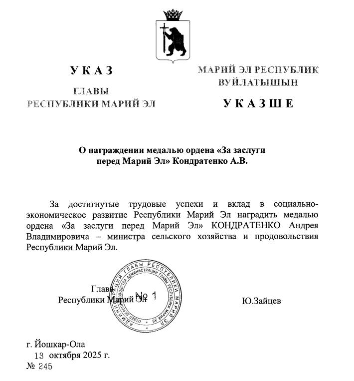 Накануне Александр Кондратенко был награжден медалью ордена «За заслуги перед Марий Эл». Награда была получена за достигнутые трудовые успехи и вклад в социально-экономическое развитие региона, говорится в Указе главы Марий Эл от 13 октября.