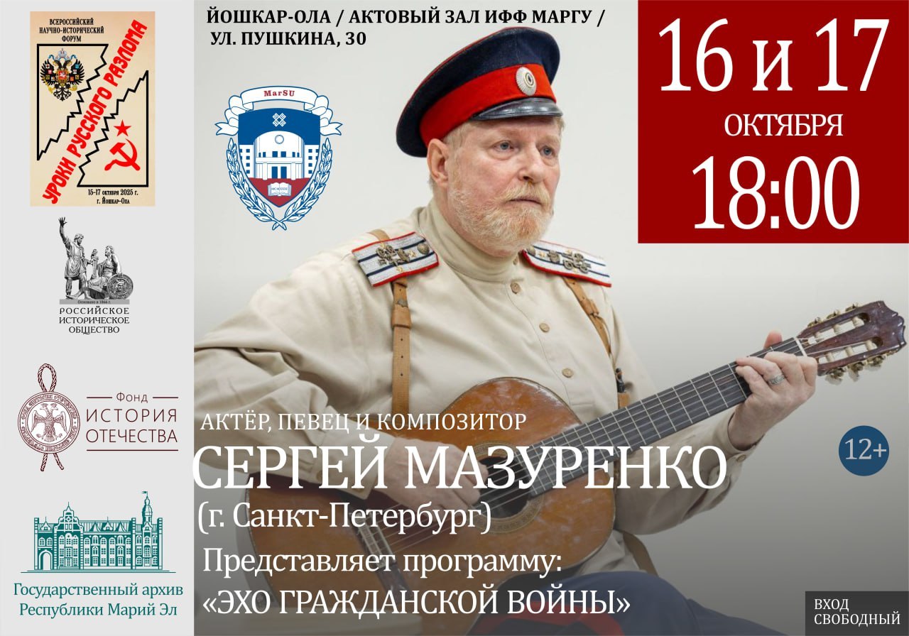 В рамках Всероссийского научно-исторического форума «Уроки русского разлома» 16 и 17 октября в актовом зале историко-филологического факультета МарГУ пройдут открытые концерты актёра из Санкт-Петербурга, поэта и композитора, автора исполнителя, собирателя и популяризатора песенного наследия Русской армии Сергея Евгеньевича.