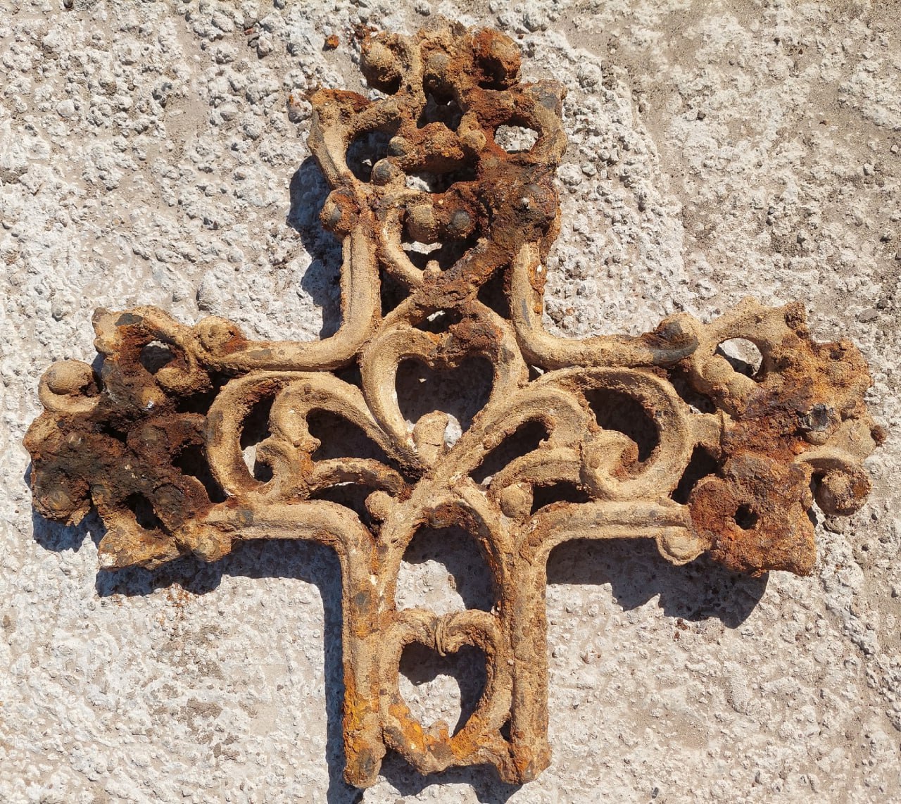 Обломок довольно массивный и тяжелый, отлит из чугуна. По версии археологов, этот крест может быть надвратным, когда-то устанавливался над входом на территорию храма, на что указывает его сложная форма и размер.