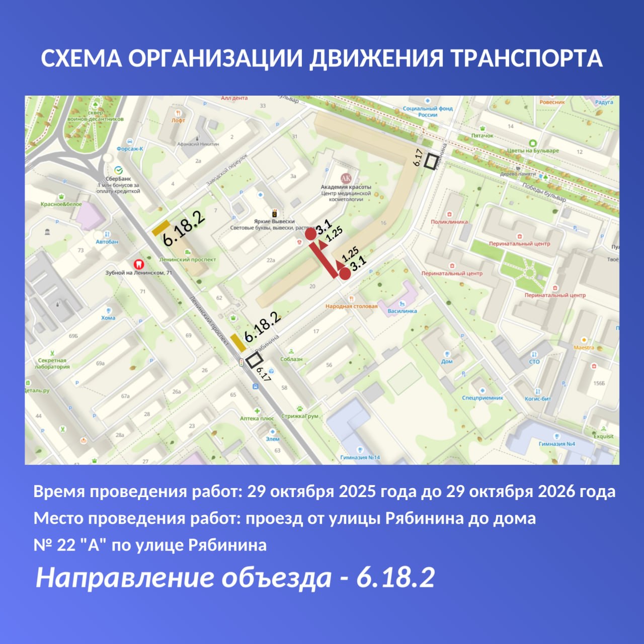 С 29 октября 2025 года по 29 октября 2026 года будет ограничено движение всех транспортных средств на проезде от улицы Рябинина до дома № 22 "А" по улице Рябинина, сообщают в администрации города.