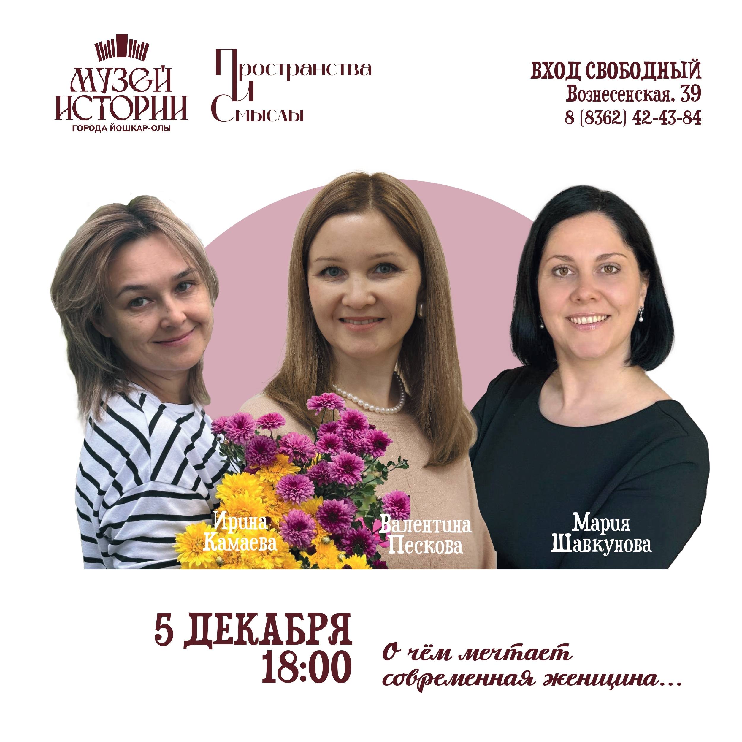 Музей истории города Йошкар-Олы 5 декабря приглашает всех желающих принять участие в диалогической встрече «О чём мечтает современная женщина...» и обсудить важные вопросы вместе с приглашёнными гостями: