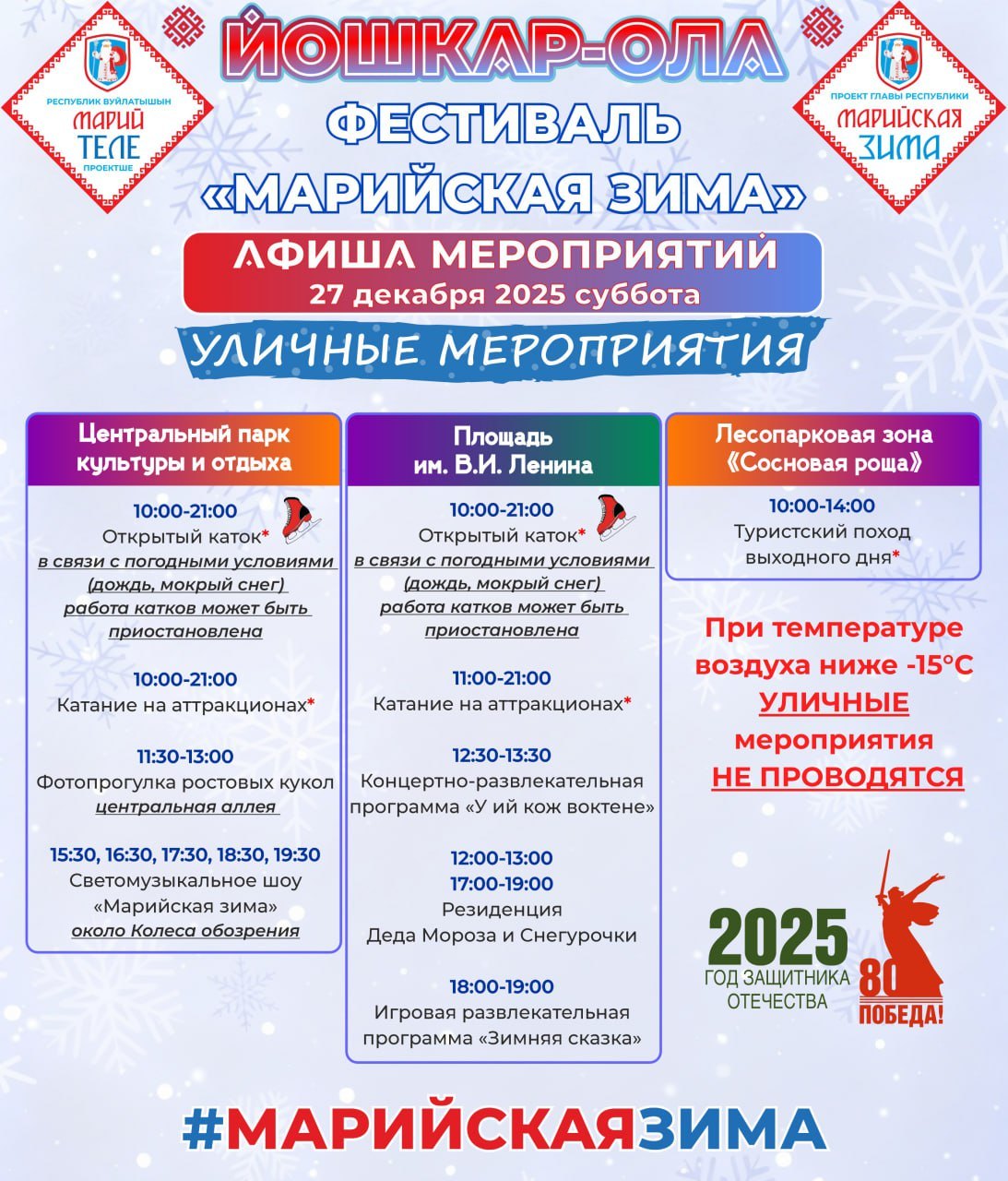 На площади им. В.И. Ленина развернутся новогодние представления и игры с Дедом Морозом и Снегурочкой. Центральный парк предложит мастер-классы, фотозоны и светомузыкальное шоу. Парк Победы и Марий парк приглашают на интерактивно-развлекательные программы, а в Сосновой роще состоится туристический поход.