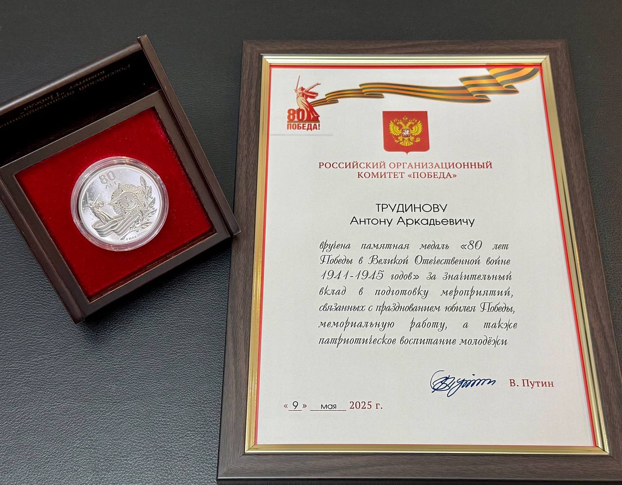 Награду лично вручил Глава Марий Эл Юрий Зайцев. Основанием для присуждения медали стали весомый вклад Антона Трудинова в подготовку к празднованию юбилея Победы, его деятельность по сохранению памяти и работе с молодежью в духе патриотизма.