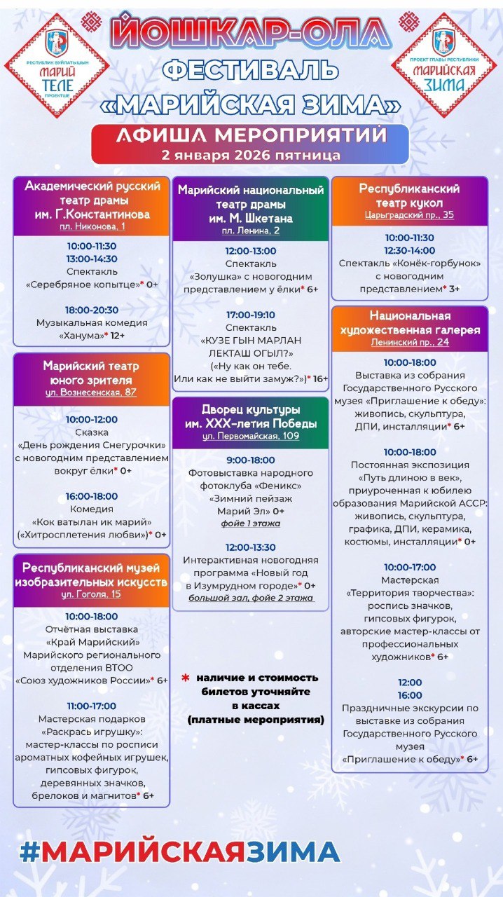 После оливье диетологи советуют больше двигаться! Проводите каникулы активно, планируйте отдых с друзьями или всей семьей вместе с «Марийской зимой». Публикуем афишу на 1-2 января.