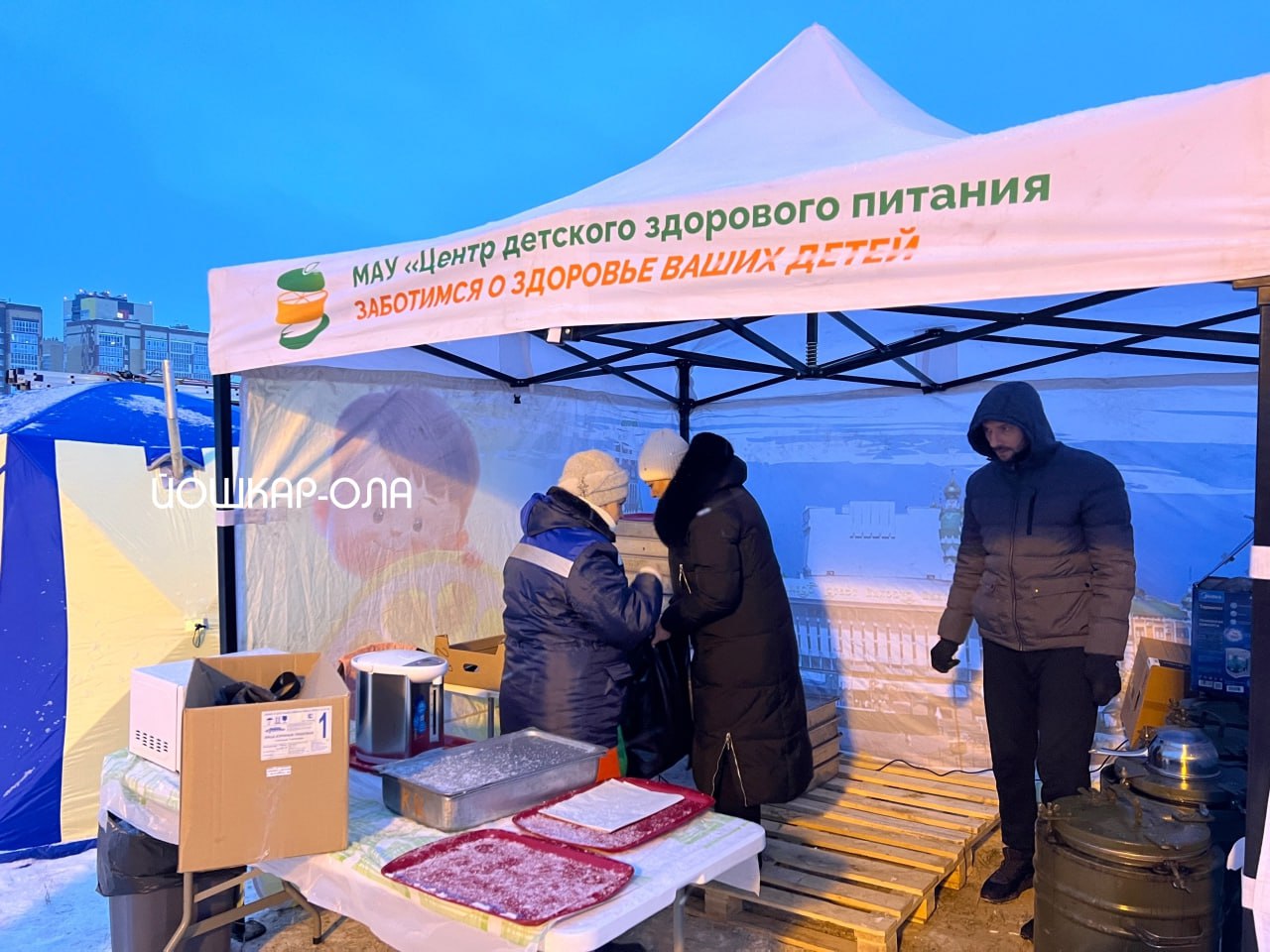 Безопасность обеспечивают сотрудники МЧС. Спасатели у купели помогают перенести тапочки и держат полотенце для согревания. А Центр детского здорового питания угощает горожан горячим чаем – самое то после холодного погружения!