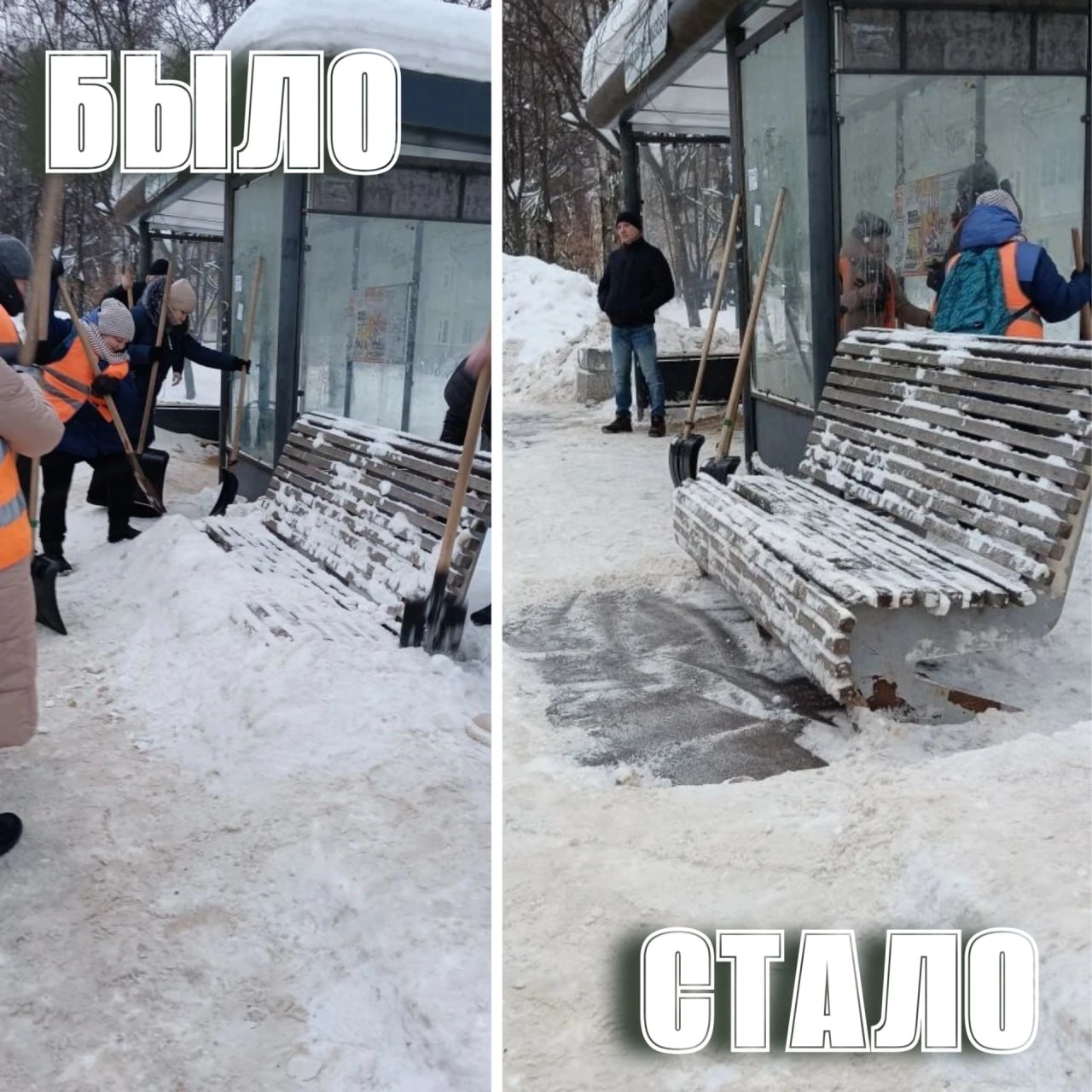 Бригады ручного труда АО «Город» продолжают работы по зимней уборке. Помимо рутинной, но жизненно важной расчистки выходов на пешеходные переходы и лестничные спуски, они занимались остановочными павильонами.
