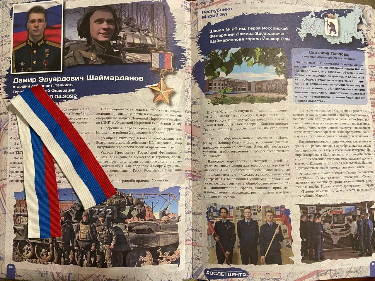 Издание, собранное Российским детско-юношеским центром, рассказывает о военнослужащих, чьи имена носят школы по всей стране. Марий Эл представлена школой 29 Йошкар-Олы, названной в честь Дамира Шаймарданова.