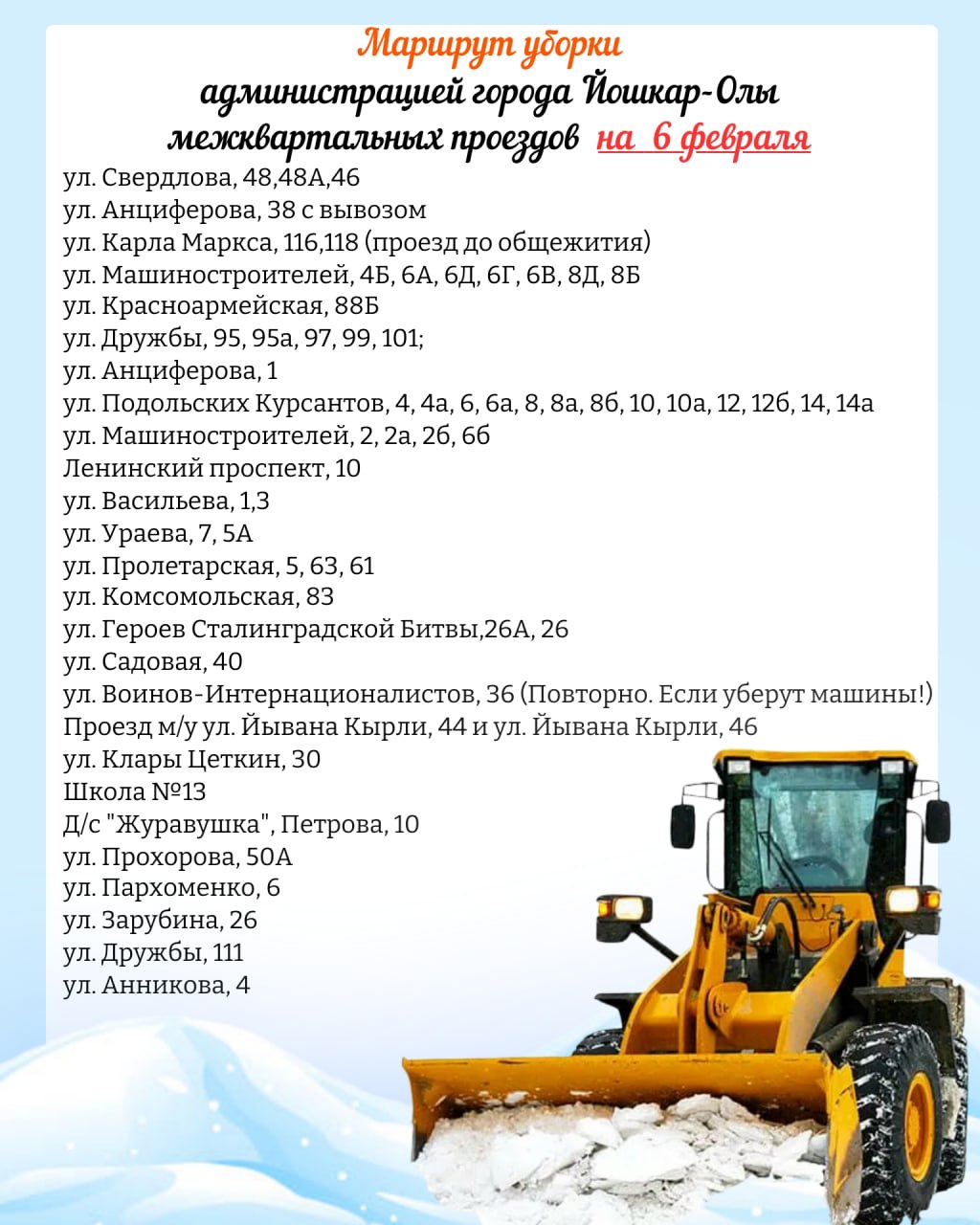 Публикуем планируемый маршрут движения снегоуборочной техники по расчистке межквартальных проездов на 6 февраля 2026 года.
