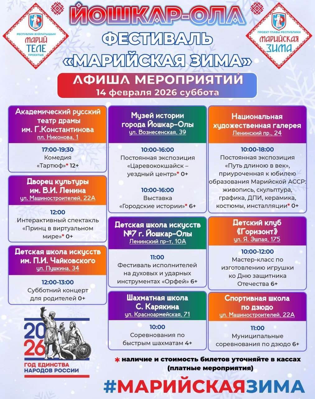 Соревнования по быстрым шахматам, фотопрогулка ростовых кукол, мастер-классы, выставки, катание на коньках и множество других приятных сюрпризов ожидают жителей и гостей Йошкар-Олы 14 и 15 февраля на фестивале «Марийская...
