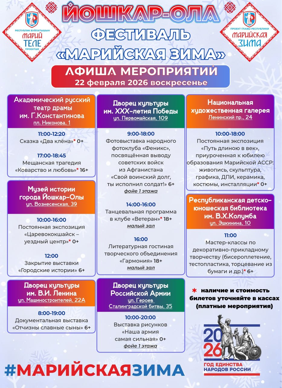 В рамках фестиваля «Марийская зима» в Йошкар-Оле с 21 по 23 февраля жителей и гостей города ожидает насыщенная программа.