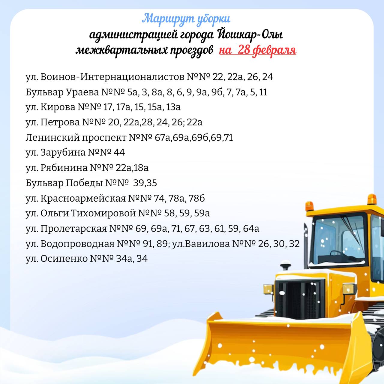 Публикуем планируемый маршрут движения снегоуборочной техники по расчистке межквартальных проездов на 28 февраля
