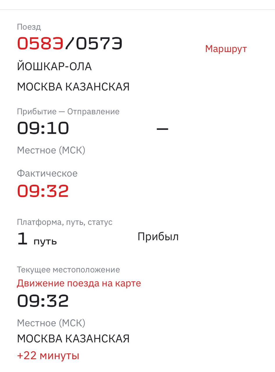 Поезд 058Э Йошкар-Ола - Москва опаздывает на 22 минуты. Он должен был прибыть в столицу России в 09:32, следует из онлайн-табло РЖД.