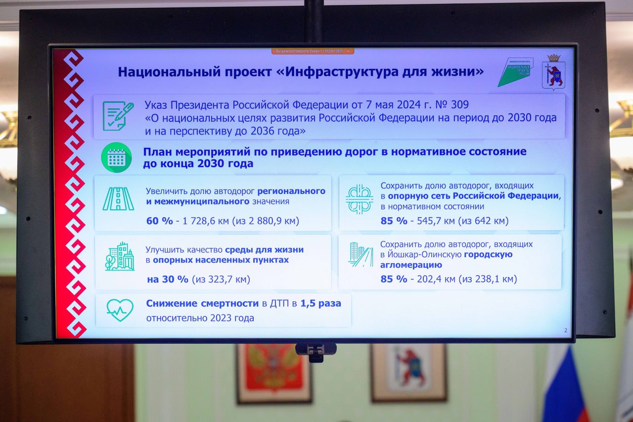 Доля дорог регионального значения, находящихся в нормативном состоянии, составила 56,6% (1 631 километр), превысив план на 2,8%. В Йошкар-Оле доля нормативных улично-дорожных сетей достигла 88,3%, что на 1,8% выше запланированного. Улучшилось состояние региональных дорог, входящих в опорную сеть Российской Федерации, - показатель составил 92,6%, превысив план на 12,7%.