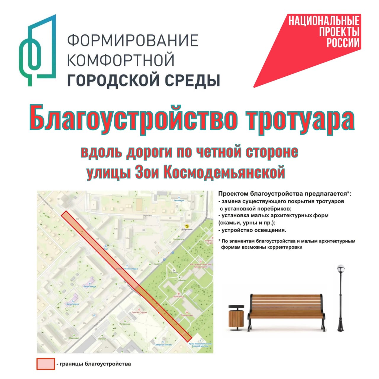 Дизайн-проект предусматривает комплексное обновление тротуара по четной стороне улицы от проезда между домами №130 и 132 до храма Иверской иконы Божией Матери. Планируется заменить покрытие, установить бордюры и малые архитектурные формы (скамьи, урны), обеспечить качественное освещение.