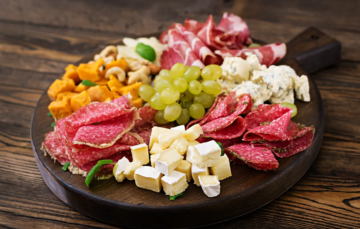 - Елочка из сыров и винограда: Превратите обычную нарезку сыров в новогоднюю композицию. Для создания этого блюда понадобятся различного вида сыры, виноград и веточки розмарина. Идея проста: нарежьте сыры кубиками, выложите их на блюдо в форме елочки, добавив виноград для цвета. Веточки розмарина добавят атмосферу хвои, а грецкие орехи или миндаль завершат композицию.
