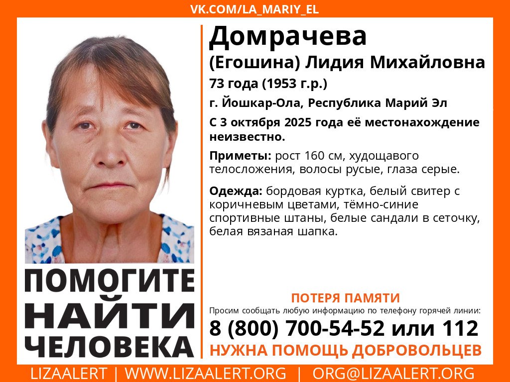 Пропала #Домрачева (Егошина) Лидия Михайловна, 73 года, г. Йошкар-Ола, Республика Марий Эл