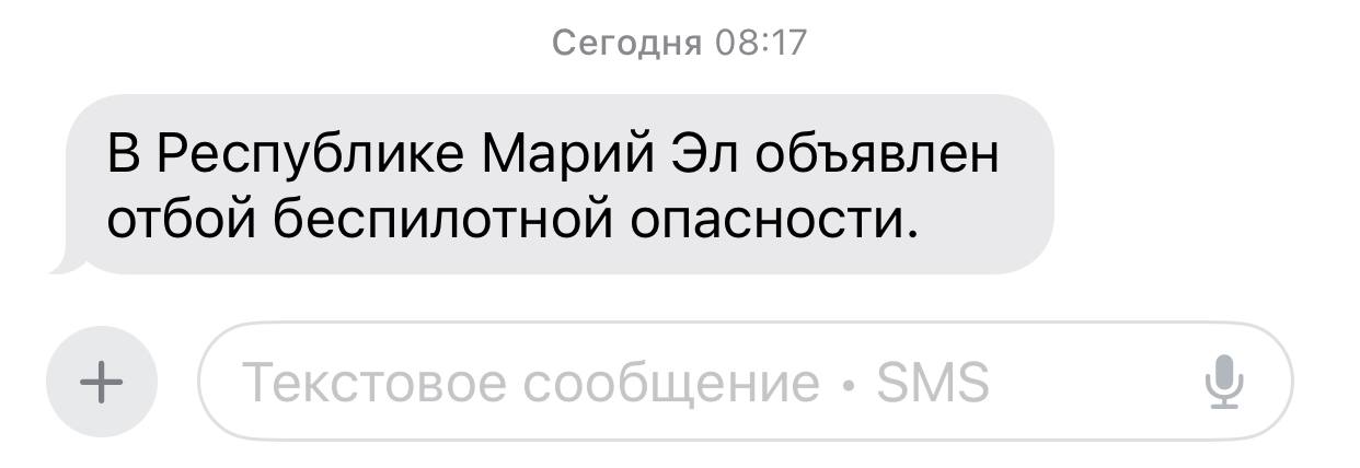 Сегодня в 03:34 была объявлена беспилотная опасность. Это второе оповещение с начала недели. Аналогичное сообщение поступило на сотовые телефоны мариэльцев в понедельник, 6 октября, в 7 утра.Сообщение приходит с номера RSCHS.Жителям республики...