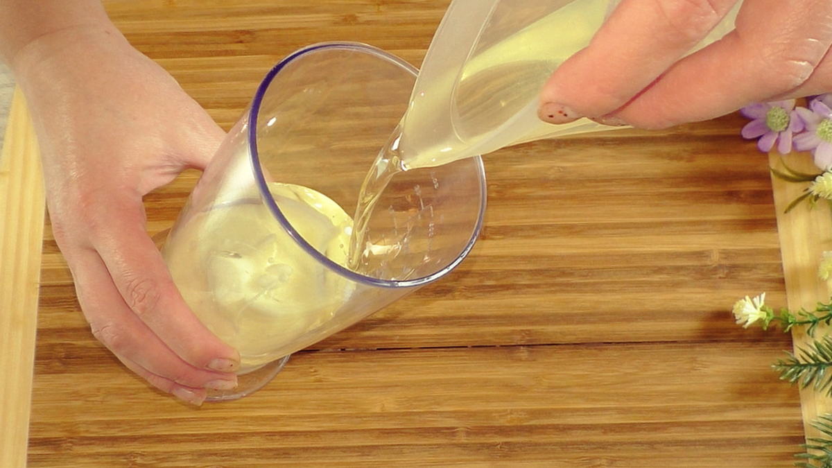 Перед началом приготовления убедитесь, что молоко и растительное масло находятся при комнатной температуре — это поможет достичь наилучшей консистенции. Для удобства рекомендуется использовать погружной блендер. В первую очередь, в чашу блендера нужно налить молоко, затем добавить растительное масло.