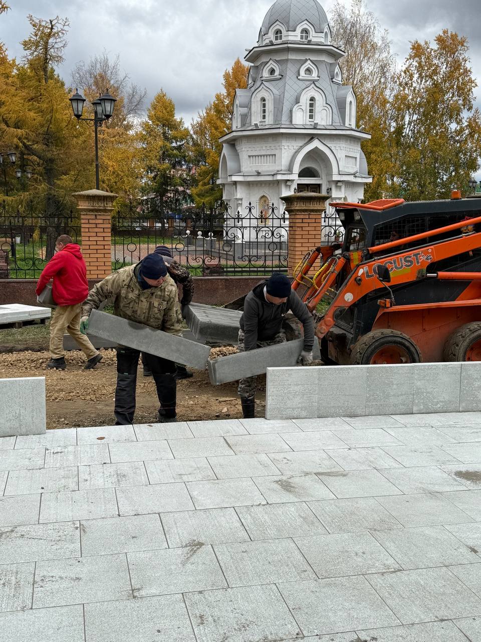 Здесь обустраивается покрытие под стать историческому центру города. Каждая гранитная плита весит около 25-30 кг. Работа по укладке трудоемкая, но результат того стоит, будет красиво и долговечно. Появятся также скамейки для отдыха, а весной в вазонах будут расти цветы.