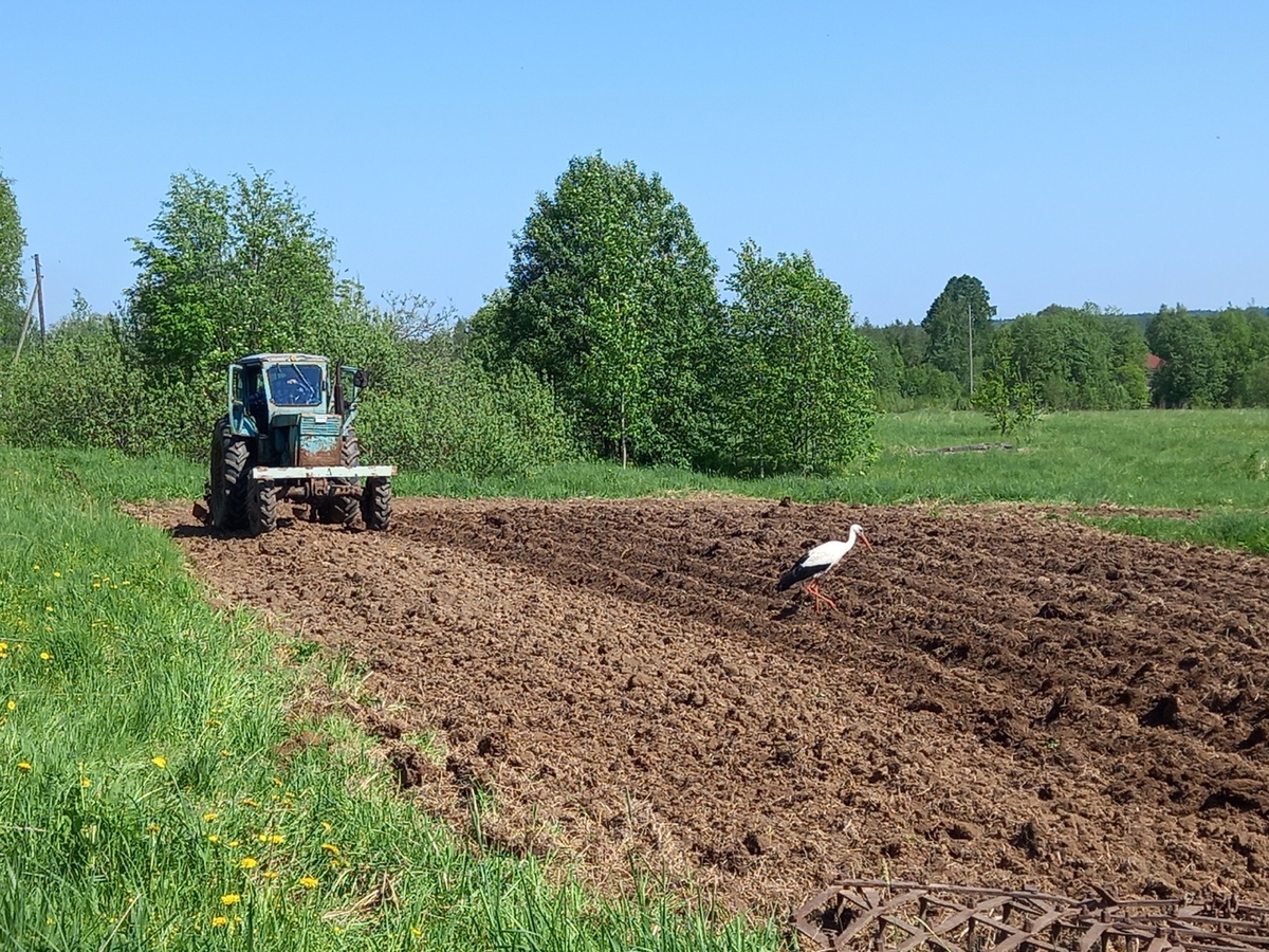 Температура за окном подбиралась к максимуму, а комары и мошки, казалось, не оставляли в покое ни на минуту. Уставшие дачники всё же нашли момент для легкого досуга: в процессе ручной работы к ним неожиданно присоединился аист, который незаметно наблюдал за происходящим.