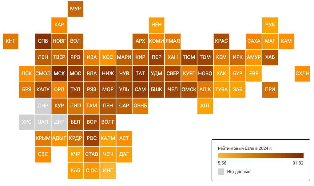 По итогам 2024 года, рейтинговый балл республики составил 39,63. По сравнению с 2023 годом она поднялась на девять позиций.