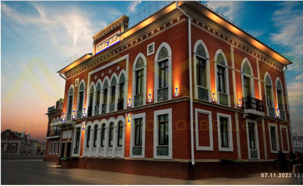 Закончить работы в доме №6 на улице Архангельская слобода планируется к 12 декабря. 7 акцентных светильников понадобится для освещения аркады, 24 – для освещения простенков, 12 – для освещения фронтона. Для управления будет предусмотрено программируемое астрономическое реле времени устройство для автоматического включения и выключения освещения в зависимости от времени восхода и заката солнца.