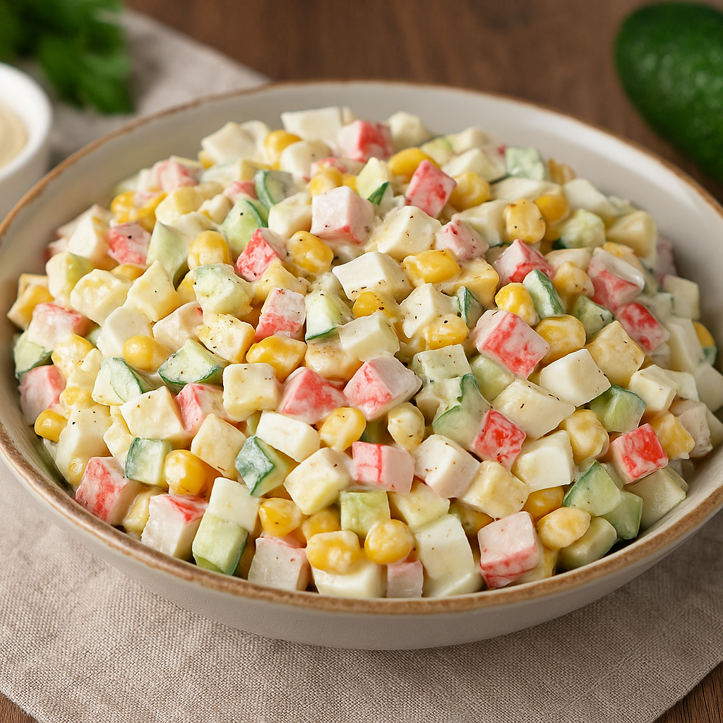 Добавление консервированной кукурузы сделает вкус более ярким и придаст легкую сладость. Основная заправка состоит из оливкового майонеза, который аккуратно перемешивается с остальными компонентами, добавляя соль по вкусу. После этого рекомендуется оставить салат в холодильнике на 15-20 минут, чтобы все вкусы сбалансировались и «подружились» друг с другом.