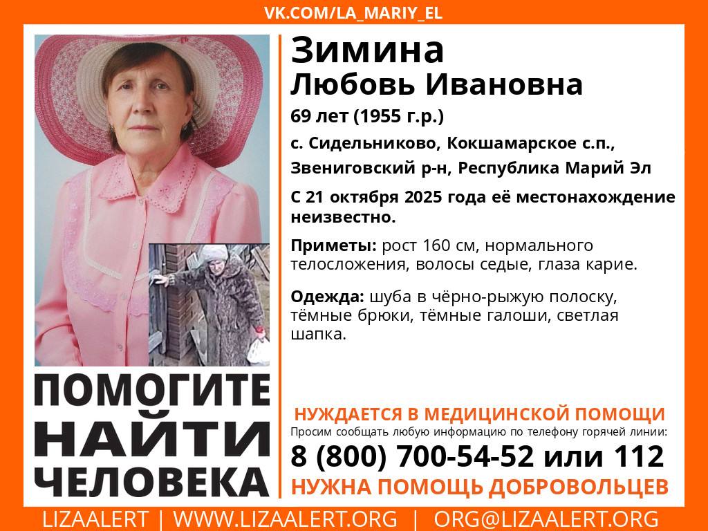 Пропала #Зимина Любовь Ивановна, 69 лет, с. Сидельниково, Кокшамарское с.п, Звениговский р-н, Республика Марий