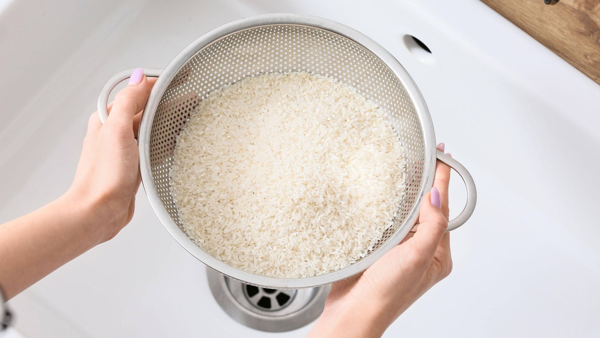 Вам понадобится соль. На литр воды будет достаточно столовой ложки. Растворите приправу в жидкости, а затем готовым раствором промойте рис.