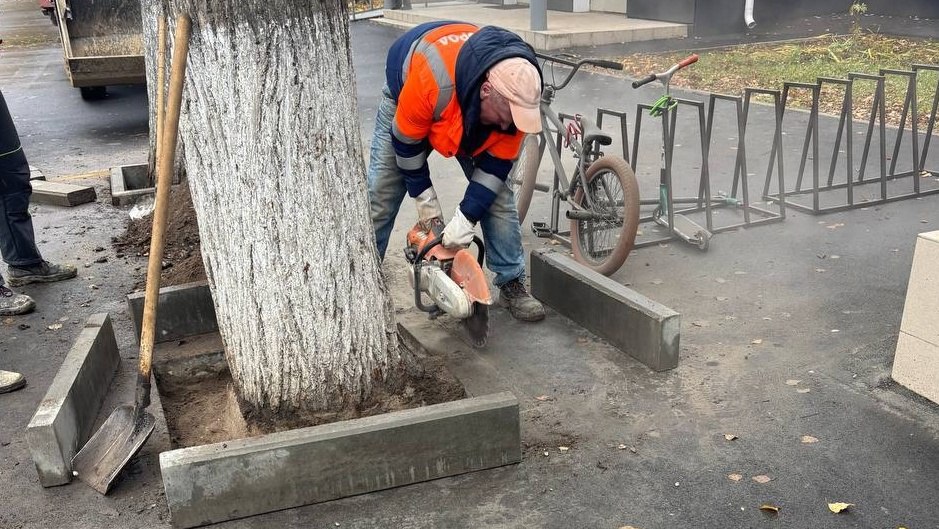На тротуаре у школы №7 в Йошкар-Оле провели работы вокруг деревьев