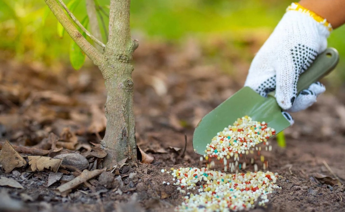 - Сухая подкормка: Применяется чаще всего. Удобрения равномерно распределяются по поверхности земли в зоне корней дерева. После этого почву рекомендуется полить для лучшего растворения питательных веществ.