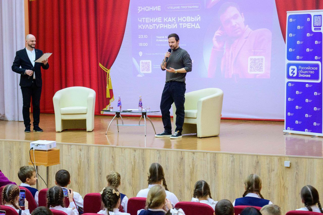 Сегодня в школе №15 Йошкар-Олы прошла встреча с лектором Российского общества «Знание», известным актёром и кинорежиссёром Алексеем Чадовым. Темой открытого диалога со школьниками стала «Чтение как новый культурный тренд».
