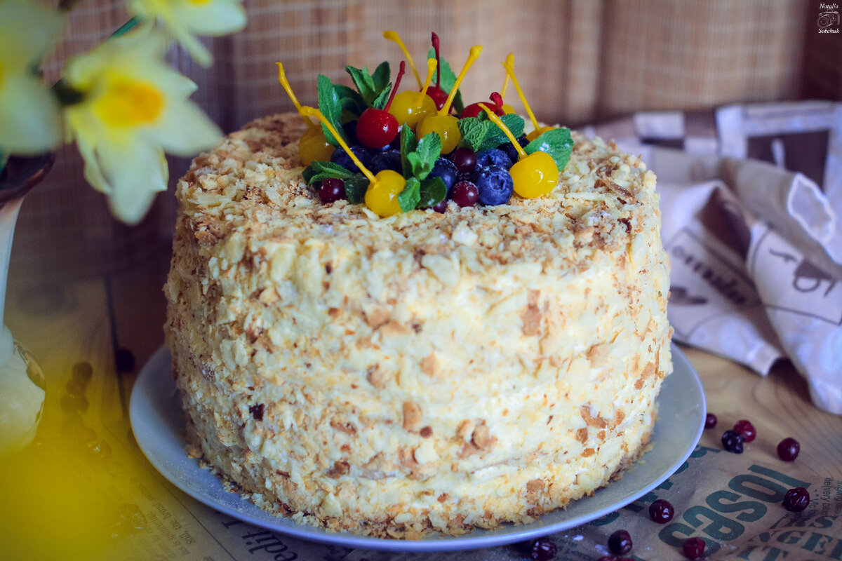 На следующий день разделите тесто на 13 частей и раскатайте каждую в круг диаметром 20 см. Выпекайте коржи в заранее разогретой духовке (200°C) в течение 10-15 минут и затем остудите на решетке.
