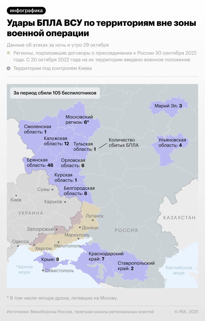РБК публикует инфографику атаки украинских дронов на российские регионы, в том числе на Марий Эл, в ночь на 29 октября.