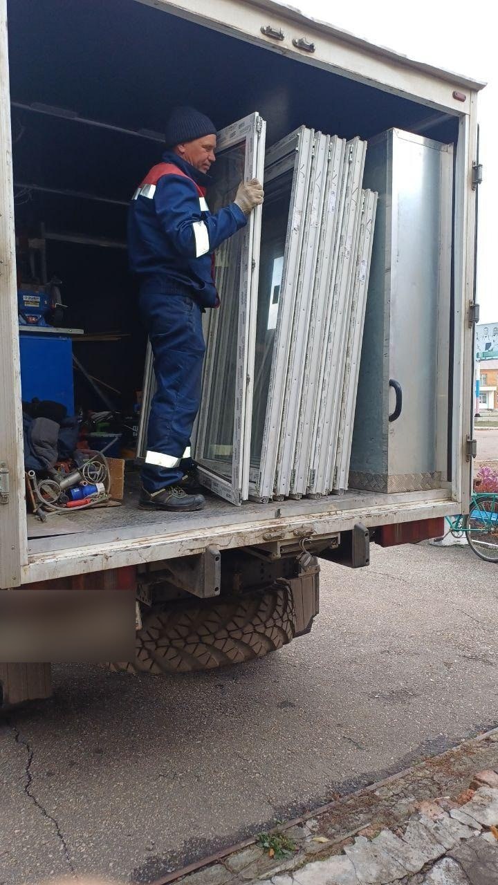 В селе Гусарка Запорожской области мастера аварийно-восстановительной бригады из Марий Эл меняют старые сгнившие окна и двери в здании местной администрации.