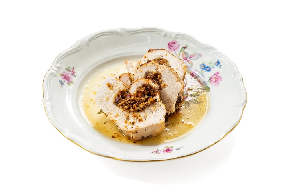 Подготовить все ингредиенты и разогреть духовку до 180 градусов.На противне равномерно распределить фисташки и поджарить их в духовке в течение 7 минут.После поджаривания очистить фисташки от шелухи и мелко нарезать.Снять листья с 3 веточек тимьяна и измельчить их.Репчатый лук нарезать мелкими кубиками и обжарить на растопленном сливочном масле до мягкости.В сковороду к луку добавить панировочные сухари, нарезанные фисташки, лимонную цедру, 2 столовые ложки лимонного сока и половину измельченного тимьяна. Жарить до золотистого цвета сухарей.Индейку обсушить и положить на доску кожей вниз. Наполнить ее начинкой, закрутить в рулет и перевязать кулинарной нитью.Форму для запекания застелить бумагой и выложить оставшиеся веточки тимьяна на дно. Затем поместить индейку, смазать оставшимся маслом, приправить солью и перцем.Запекать индейку в предварительно разогретой духовке при 160 градусах в течение 2 часов. После приготовления накрыть фольгой и оставить на 10 минут для настаивания.Снять нить и нарезать индейку на кружочки.Подавайте индейку с соусом, оставшимся при запекании.Этот рецепт — отличный способ порадовать близких и сделать праздник незабываемым. Нежная индейка с хрустящей начинкой из фисташек и лимоном — идеальное сочетание для любого стола, пишет Дзен-канал "Еда.ру".