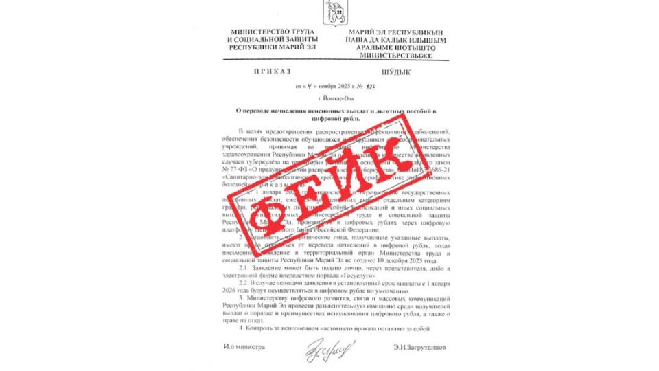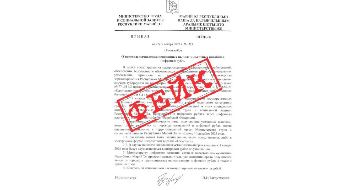 Министерство труда и социальной защиты Марий Эл официально опровергло распространяющуюся в социальных сетях и мессенджерах ложную информацию. В сети был опубликован поддельный приказ ведомства о якобы переводе начисления пенсий и социальных пособий на цифровой рубль.