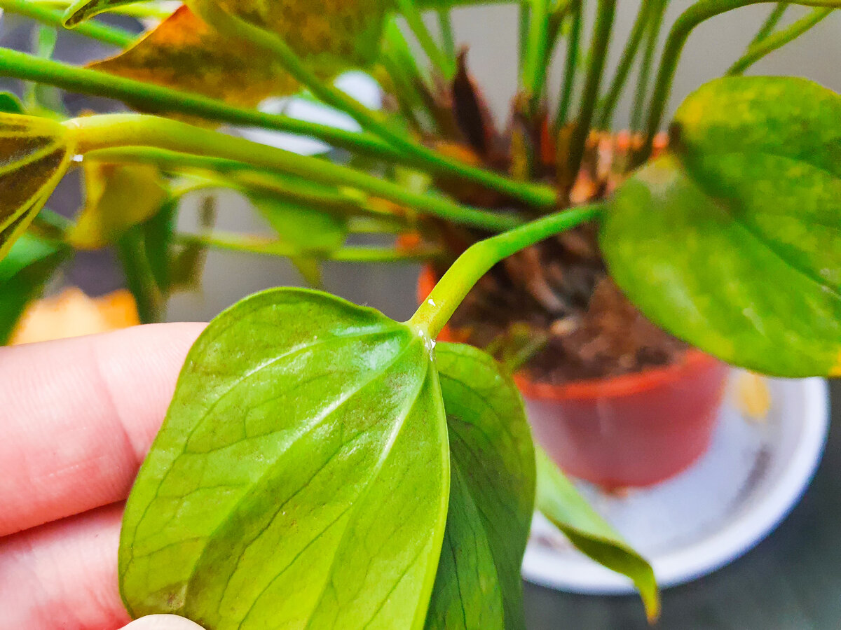 Приглядевшись к своему антуриуму, можно заметить тревожные признаки. Листья начинают желтеть, что всегда вызывает опасения. Кроме того, наблюдаются черные пятна на обратной стороне листьев, а некоторые листья покрываются загадочной «белой ватой». Эти симптомы могут сигнализировать о серьезных проблемах, от переувлажнения и грибковых инфекций до нападения вредителей, таких как мучнистые червецы.