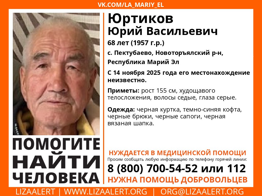 Пропал #Юртиков Юрий Васильевич, 68 лет, с. #Пектубаево, #Новоторъялский р-н, Республика Марий Эл