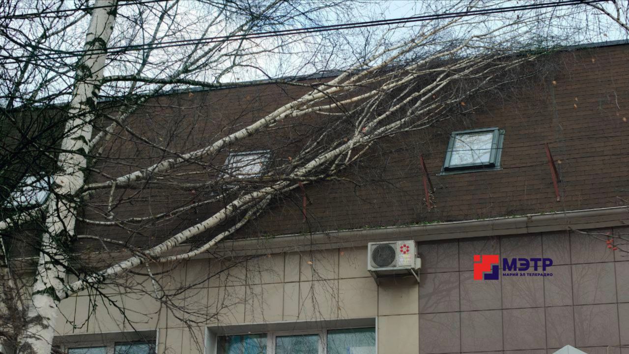 В Йошкар-Оле коммунальщики ликвидируют последствия непогоды. Проигравшие битву со стихией деревья распиливают и убирают с крыши торгового центра.