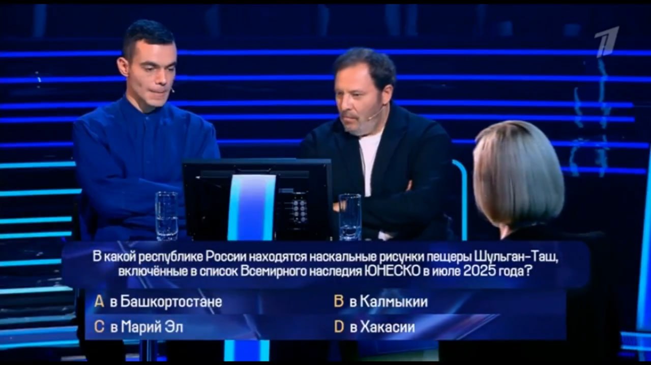 Когда участники дошли до девятого вопроса, который оценивается в 50 тысяч рублей, им предстояло ответить, в какой республике России находятся наскальные рисунки пещеры Шульган-Таш, включенные в список Всемирного наследия ЮНЕСКО в июле 2025 года.