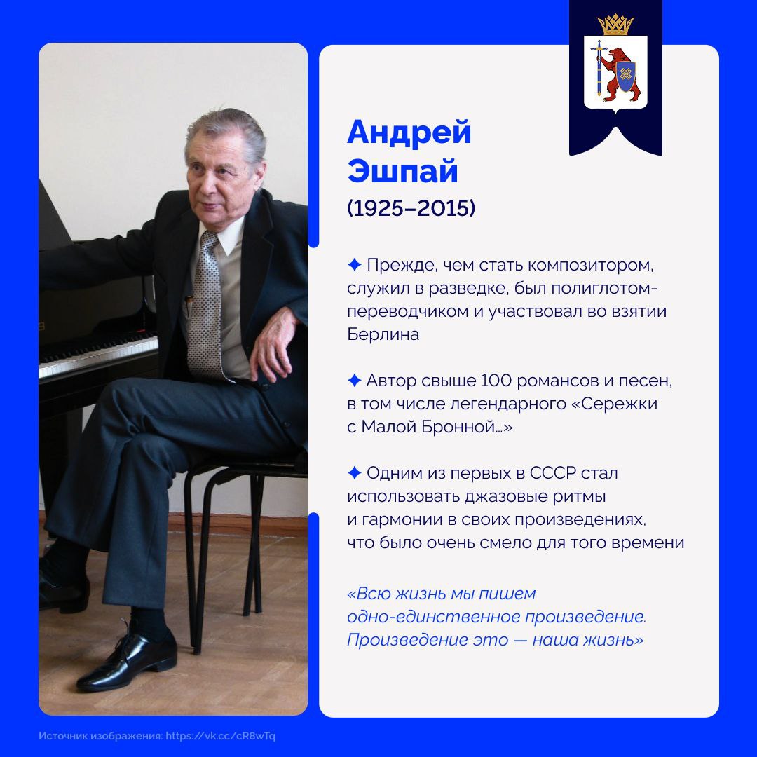 Андрей Эшпай — фронтовик-орденоносец, народный артист СССР и первый в мире композитор, создавший концерты для всех инструментов симфонического оркестра, родился в Козьмодемьянске.