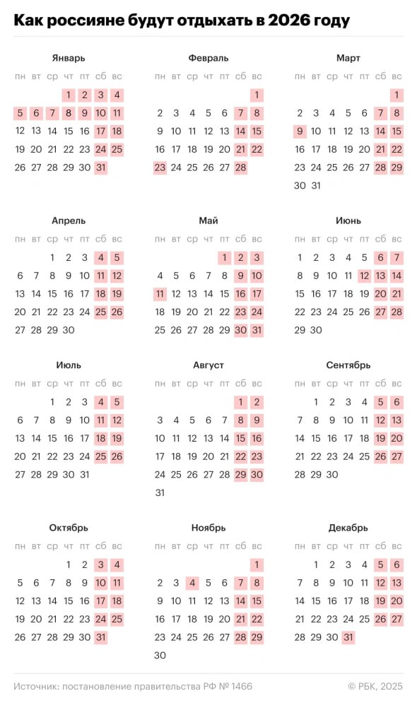 Они выпадут на февраль, март, апрель, май, июнь, ноябрь и конец декабря. Выходными также объявят 4 ноября и 31 декабря. Новогодние каникулы продлятся рекордные 12 дней — с 31 декабря 2025 года по 11 января 2026 года.